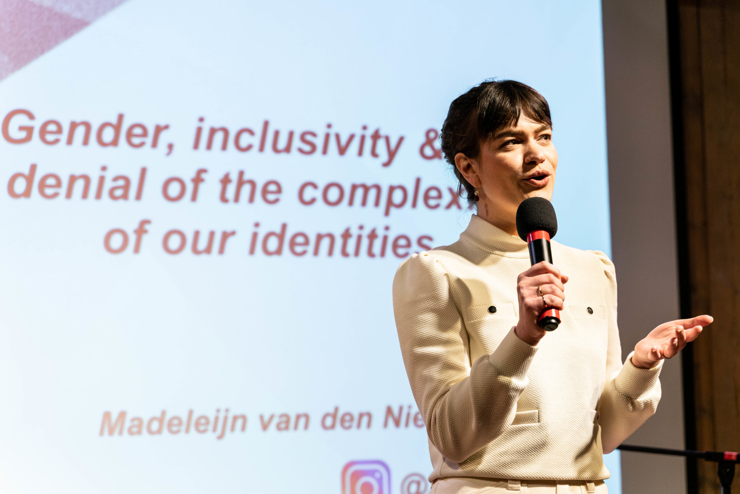 Madeleijn van den Nieuwenhuizen, bekend van het Instagram-account Zeikschrift sluit het event af. In haar presentatie neemt zij ons mee langs de misstappen die de media maken als het aankomt op beeldvorming van gender en inclusiviteit. Augustina Austin, beter bekend als MS.ABA, verrijkte de avond met haar prachtige muzikale bijdragen.