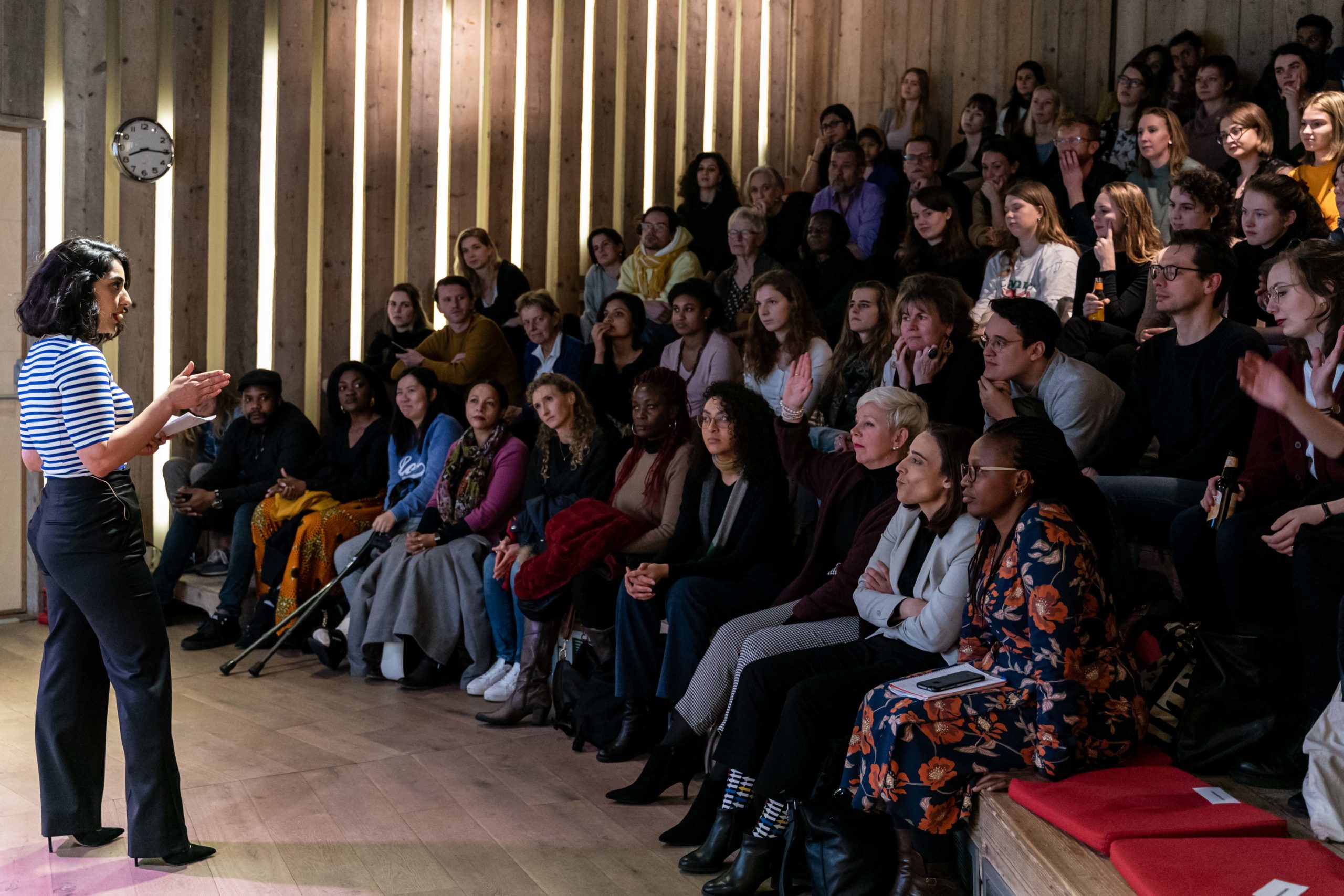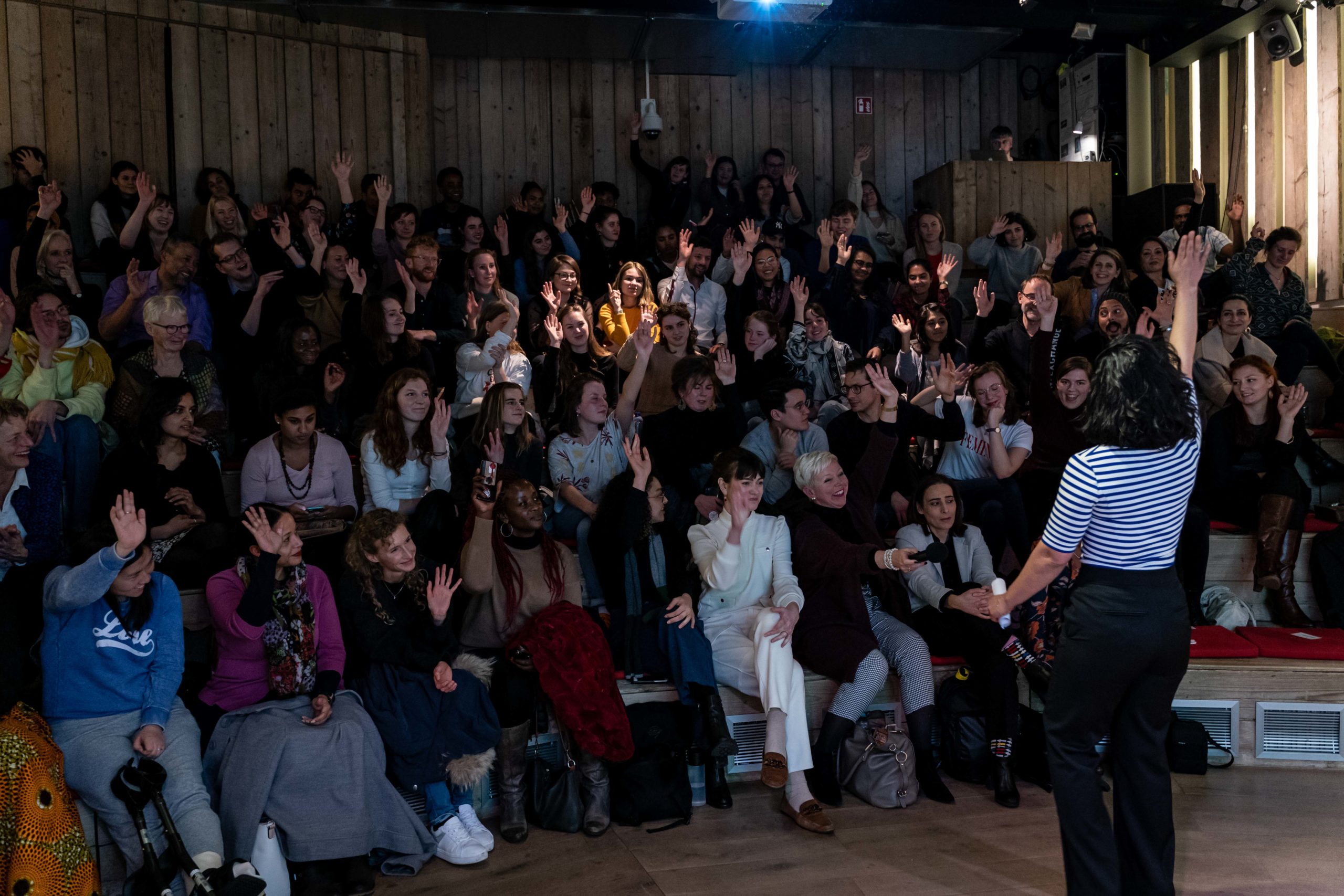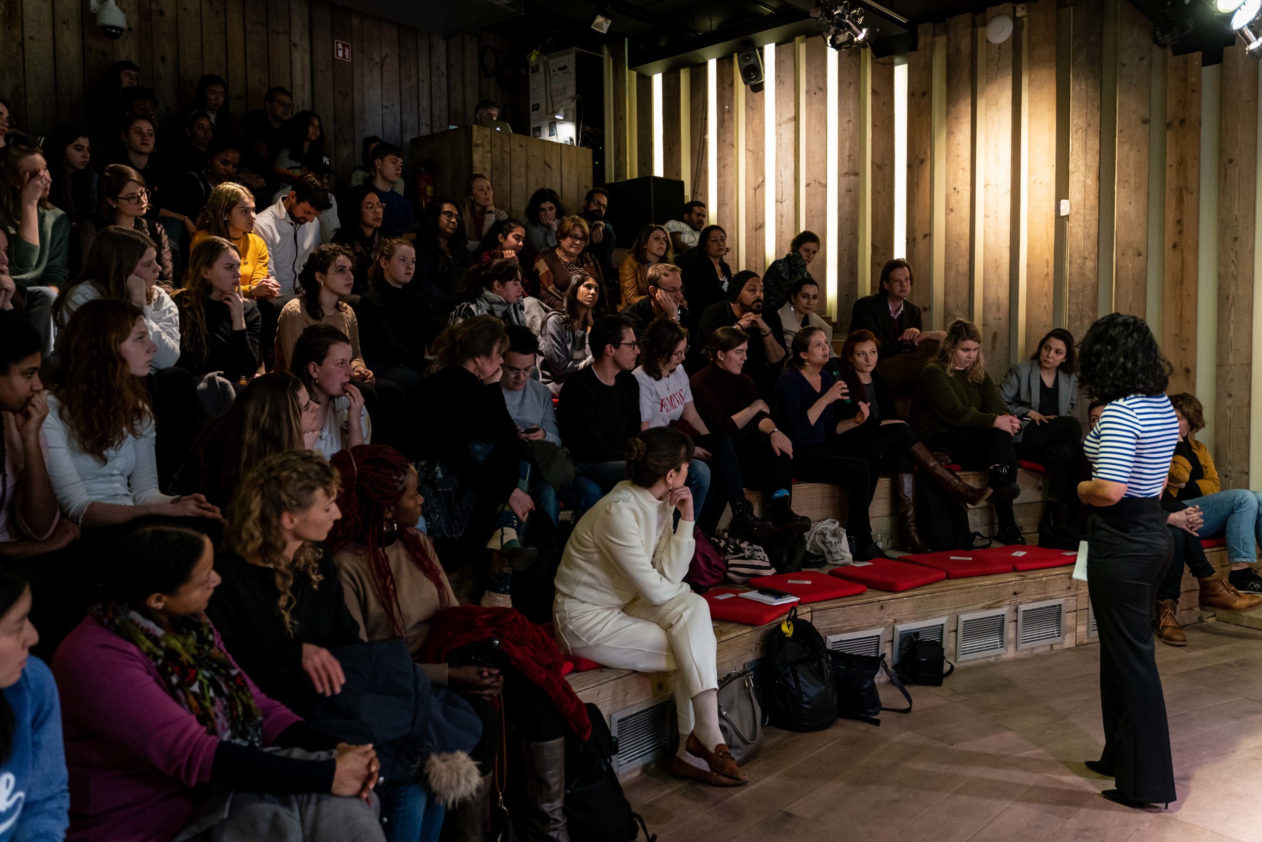 “Wie noemt zichzelf een feminist?” vraagt Sahar Shirzad, moderator en gastvrouw, aan een bomvolle zaal bij de aftrap van het evenement. In het publiek schieten de handen de lucht in, en niet alleen van vrouwen. Gelijkgestemden uit Den Haag en omgeving zijn bij elkaar gekomen om zich te laten inspireren door persoonlijke verhalen, discussie en muziek.